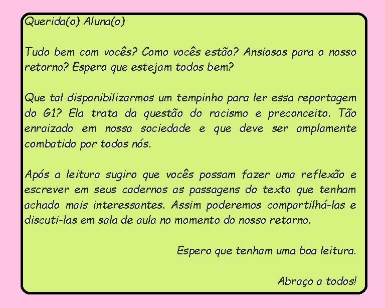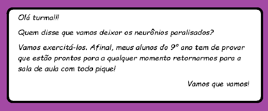Essa página é dedicada a atualizar você, aluno do 9A, sobre os conteúdos e atividades das suas diversas matérias. Suas aulas estarão aqui, tudo para ajudar você a desenvolver todo o seu potencial. Vamos lá?